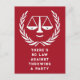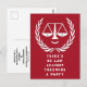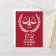Invitaciones creativas para la fiesta de un abogado para celebraciones de graduación de la facultad de derecho, anuncio de un despacho de abogados, anuncio de graduación o fiesta de cumpleaños con divertidas balanzas de la justicia sobre fondo rojo.