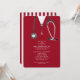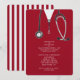 Invitaciones creativas para la fiesta de graduación de la facultad de medicina con características batas rojas de hospital y arte de estetoscopio. Edite el texto para crear una invitación única para la fiesta de médicos.