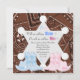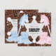 Fondo adorable de bandana marrón con caballitos de palito rosas y azules, botas de vaquero, botas de vaquera, herraduras y sombreros invitaciones para la fiesta de revelación de género vaquero. Personalice la parte delantera y trasera de esta adorable invitación de fiesta de revelación de género vaquero agregando los detalles de su evento, estilo de fuente, tamaño y color de la fuente, y redacción. Tenga en cuenta que todos los diseños de invitaciones que encontrará en Zazzle son gráficos impresos en papel liso sin joyas reales, lazos, partes o piezas en relieve, estampadas o agregadas.