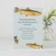 Invitaciones de fiesta para adultos para un pescador. Diseño de trucha moteada y señuelo de mosca en papel gris-azul con texto oscuro. Utilice para una celebración de cumpleaños o jubilación para el hombre que vive para pescar. Personalice el texto en dos secciones con texto impreso en negrita en la parte superior para decir "Felicidades por su jubilación" o "Feliz cumpleaños número 50" con su nombre. Incluya mucho texto con información de la fiesta, o utilice espacios para rellenar el párrafo. Perfecto para el cumpleaños de un esposo o la fiesta de jubilación de un padre.