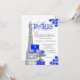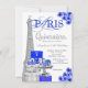 Invitación a la fiesta de cumpleaños de Quinceañera Paris Sweet con la hermosa Torre Eiffel plateada, elegantes paquetes de regalo de París, zapatos de tacón alto con brillo plateado y elegante escritura de París en azul real sobre un fondo floral azul rico. Esta hermosa invitación de Quinceañera de París se personaliza fácilmente para su evento simplemente agregando sus detalles en el estilo de letra y color, y redacción de su elección. Este es un diseño impreso sin diamantes reales, joyas, brillo, etc.