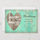 Rústico Aqua Green Barn Wood con forma de corazón cortado para una invitación a una boda de campo única. La parte trasera de la invitación boda también tiene el diseño de madera para el corazón y el granero con la palabra "Amor" dentro del corazón. Estas son grandes invitaciones bodas para una boda rústica de campo y para cualquiera que use aqua en sus colores bodas. Plantilla fácil de editar. 40% OFF cuando se piden más de 100 invitaciones.