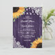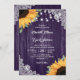 Invitaciones a bodas rústicas moradas de flores inspiradas en girasoles, madera rústica, arpillera y encaje.