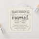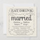 Coma, bebe y cásate... invitaciones rústicas de casamiento al estilo vintage... Deslizamientos rápidos y rizados y tipografía de la vieja moda sobre el fondo de un antiguo pergamino blanco crema de marfil. Agrega tus nombres e información de boda en esta plantilla fácil de usar. Elegante pero divertida y caprichosa, la caligrafía estilo pizarra puede ser modificada para su tema formal o semiformal de boda retro. El moderno estilo informal es perfecto para bodas contemporáneos de moda con un toque divertido y sofisticado para el novio y la novia tradicionales. Póngase en contacto con nosotros para obtener ayuda sobre la personalización si necesita espacio adicional para los detalles de su boda. Otros tamaños y estilos de pizarra disponibles, junto con los estilos coordinados para la fiesta de compromiso y las duchas de parejas.NOTA Este diseño de producto está configurado sólo para tarjetas cuadradas — requiere envío extra.
