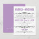 Invitaciones modernas diseñadas para bodas en las que la pareja tiene una boda en destino o una pequeña ceremonia de boda privada, y solo invita a los invitados a la celebración de la recepción. La tipografía en la parte delantera de estas invitaciones está diseñada en fuentes moradas y grises, y la parte trasera es de color morado sólido con texto blanco opcional para posible información de RSVP.