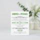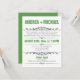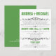 Invitaciones modernas diseñadas para bodas en las que la pareja tiene una boda en destino o una pequeña ceremonia de boda privada, y solo invita a los invitados a la celebración de la recepción. La tipografía en el frente de estas invitaciones está diseñada en fuentes verdes y grises, y la parte trasera es un verde sólido con texto blanco opcional para posible información de RSVP.