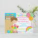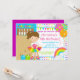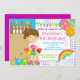 Comience a su fiesta de cumpleaños del chica de la derecha con nuestra huelga brillante y colorida linda encima de una cierta invitación de la fiesta de cumpleaños de los bolos de la diversión que ofrece a un chica trigueno lindo en un aliado de los bolos con bolas rosadas y anaranjadas del globo y de bolos fijadas en un fondo lindo de los lunares con el empavesado amarillo, verde, de las azules turquesas, del rosa y del naranja. La parte posterior de la invitación ofrece un color púrpura de coordinación. Completamente adaptable por usted con su información. ilustraciones del ©JW