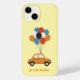 Un auto lleno de globos voladores. "Ve con el flujo" escrito a continuación.