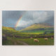 Rich emerald tones stretch across the hills, contrasted by textured gray stone walls and fluffy white sheep scattered across the fields. A brilliant rainbow arcs through the sky as sunlight breaks through drifting clouds, creating a hopeful and uplifting atmosphere. The layered depth and detailed textures make each section of the puzzle engaging and satisfying to complete, from the winding fences to the glowing horizon.