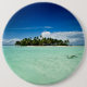 Abotone con un desierto o una isla deshabitada de la aventura con palmeras y un cielo azul marino en el agua de la turquesa de una laguna en el archipiélago pacífico Polinesia francesa