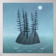 Una isla alejada en medio del océano, con pinos. La luna brilla en esta escena pacífica, ¡y el adentramiento llama la atención! Pintura marinera original de Nic Squirrell.