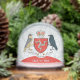 Patriotic Isle of Man Snow Globe featuring frosty snowflakes background falling behind the Isle of Man emblem (blue sky glimmer on the back) & Isle of Man Flag color, winter Christmas decoration, holiday gifts for British patriots / sports fans.