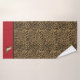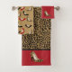 La toalla de baño de moda de las damas está hecha con un tacón alto de moda y una huella jaguar. La toalla de baño se realiza en un patrón de piel de gato jaguar marrón y negro, con acentos negros y rojos en un extremo. La toalla de mano se realiza en un patrón de tacón alto colocado en el bronceado. El paño de lavado está hecho en rojo sólido. Un par de estiletes impresos de jaguar cuelgan sobre cada toalla.