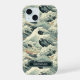 Make a statement with this iphone 15 phone case that features rolling Japanese waves in multiple shades of teal blue with splashes of earth tones. It's modern yet traditional. The pattern represents surges of good luck, peace, and eternal resilience. It becomes uniquely yours with your name in a CAP font in white on dark teal.