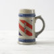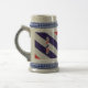 Esta taza está decorada con diagonal rojo, blanco y azul, rayas y tres postes de barbero.