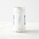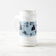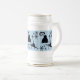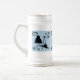 Hat, skis, goggles, & snowflakes on a light blue background beer stein . Refresh after a fun day on the slopes.