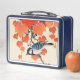 Caja de almuerzo en una pintura japonesa vintage de un pájaro marimacho azul y una vid salvaje, en tonos naranja de otoño y azul profundo, sobre un fondo beige claro, realzado digitalmente