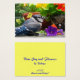 Esta colorida tarjeta de comercio de artistas cuenta con un barco azul que ha aterrizado en una terraza porche rodeada de flores. La coloración azul, gris, blanco y negro del pájaro se ve empañada por un revuelo de color. Hay una tetera decorativa con nasturtios naranjas y amarillos y una petunia violeta. Las hojas verdes completan este caleidoscopio de colores.