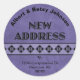 Púrpura nuevo pegatina de direcciones con su nombre curvado en un arco en la parte superior y su dirección en la parte inferior. Estilo divertido y fácil de transmitir tu mensaje.