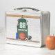 Jersey de baloncesto verde y blanco personalizado colgado en una sala de armario con baloncesto, zapatillas de baloncesto y una botella de bebidas. La camiseta es un personalizable con tu propio número y nombre, para crear un regalo verdaderamente único para el jugador de baloncesto o hincha de baloncesto. Si necesita una combinación de colores diferente, póngase en contacto con nosotros a través de la tienda