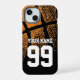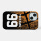 Personalizado jersey de baloncesto número presupuesto Funda iPhone 15. Diseño duradero y robusto con impresión de bolas naranja vintage. Un gran regalo para los aficionados y jugadores. Se puede cambiar el color de fondo. Portada de teléfono de la marca Zazzle.