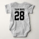 Traje para el bebé de la camiseta de fútbol. A mamá y a papá les encantan los deportes. Es natural que el bebé también. Traje de bebé lindo en gris plateado y negro. Puede personalizar el nombre y el número del jugador en la parte delantera y trasera de la camiseta. No sólo para los aficionados al fútbol. Todo tipo de aficionados al deporte apreciarán este diseño. Béisbol, baloncesto, fútbol, hockey sobre hielo y más.