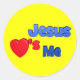 Estos lindos "Jesús me ama" pegatinas en forma de círculo son geniales para niños y adultos por igual. Estos pegatinas, una gran adición a tu aula de clases dominicales o biblias, pueden ser personalizados antes de la compra para cambiar el color de fondo a casi cualquier color que puedas imaginar.