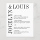 Moderno menú boda de presupuesto (impreso en papel delgado de volante) con un diseño minimalista en blanco y negro con sus nombres en una fuente grande a lo largo del lado izquierdo y superior. Este diseño es lo suficientemente sencillo para un boda formal, pero hace una declaración audaz.