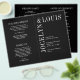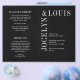 Moderno programa de bodas plegadas (impreso en papel de impresora delgado y se despliega) con un minimalista diseño negro con sus nombres en un gran tipo de letra a lo largo del lado izquierdo y superior. Este diseño es lo suficientemente sencillo para un boda formal, pero hace una declaración audaz.
