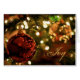 Cierre de la bola de Navidades rojos que adorna un hermoso árbol de vacaciones. Adentro se lee Feliz Navidad y Feliz Año Nuevo