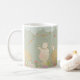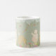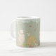 La alegre primavera lleva taza de café. Un diseño delicioso, perfecto para todo aquel que ame los osos. Dos osos felices jugando con amigos - conejito, ratón y pájaros. Fondo de oliva adornado con flores de primavera. Diseño atractivo y caprichoso para adultos y niños.