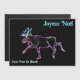 Representación como un neón de un alce de toro sobre un fondo negro. La lectura francesa de texto "Joyeux Noё l" aparece en azul y blanco resplandeciente. Añade tu propio texto adicional. Inspirado por las auroras boreales.