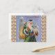Joyeux Noel es Feliz Navidad en francés. La imagen es de una hermosa postal grabado en relieve de aproximadamente 1910. La escena muestra a Santa Claus con una bata verde azul con guarnecido de piel blanca. Los colores distintos del rojo para el traje de Santa eran muy populares en las tarjetas de Navidad de principios del siglo XX. Santa se está abriendo camino a través de una tormenta de nieve usando un bastón para caminar. Un campanario de la iglesia está al fondo.