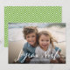 Utilice una foto horizontal con el sujeto preferiblemente en el medio. Haz un exclusivo y moderno saludo de Navidad con un brillante y alegre patrón de cheurón en la parte trasera. Si necesita mover algo, haga clic en el botón personalizar para realizar cambios.