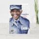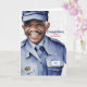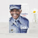 Empleado postal masculino de piel marrón con pelo blanco está listo para ofrecer sus felicitaciones al jubilado de la oficina de correos cuando personalizas la placa frontal de la tarjeta con su uniforme.