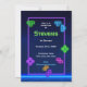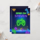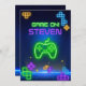 Juego activado en invitación de jugador de videojuegos neon verde, azul amarillo.