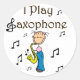 Un chica de saxofón con una figura de palos con notas musicales y texto que dice "Yo toco saxofón" en pegatinas de personalizable.