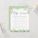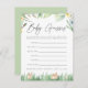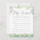 Bonito conejito de ducha de bebé adivinando tarjetas de juego con un borde superior de flores amarillas y azules con hojas verdes. En la parte inferior de la tarjeta de juego para la ducha de bebé se encuentran conejos acuarelas y huevos de Pascua con césped verde vibrante. La frase "Baby Guesses" aparece en un guión moderno de caligrafía. Personalice con instrucciones del personalizado, criterios de adivinación, el nombre de la futura madre y la fecha de la ducha de bebé. El diseño se coordina con nuestra colección de duchas para bebés de Watercolor Spring Bunnies.