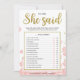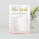 Este moderno juego de Despedida de Soltera 'Él Dijo Ella Dijo' con temática floral presenta un fondo floral rosa con salpicaduras de purpurina dorada. El texto está escrito en una mezcla de una fuente de caligrafía divertida y una fuente sans moderna, esta tarjeta 'Él Dijo Ella Dijo' está personalizada con el nombre de la Novia y la fecha de la Despedida de Soltera.