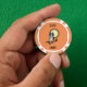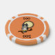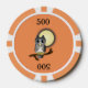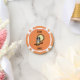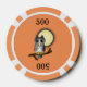 Oveja gris aguda sentada en una rama con luna llena detrás de él en un fondo naranja