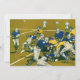 Ilustración deportiva vintage de un partido de fútbol americano con dos equipos jugando, jugadores azules contra dorados. El mariscal de campo tiene el balón y se está retirando para hacer una jugada y pasar o podría correr con él.