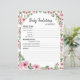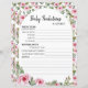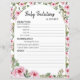 Hoja de papel con el juego "Baby Predictions & ADVICE" para la ducha de bebé. La hoja de papel de juego está decorada con adorables rosas acuáticos.