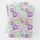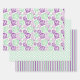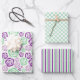 Este conjunto de 3 papel de envoltura está en color verde menta, púrpura, lavanda y blanco. Este conjunto está diseñado con rayas, motivos hombus y flores.