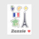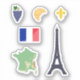 Una colección de pegatinas de los símbolos de Francia: Torre Eiffel, bandera azul blanca roja, cruasán, flor real de las lys, viñas de uvas, ¡mapa!