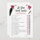 Presentamos nuestra moderna y divertida tarjeta de juego "Él dijo Ella dijo", perfecta para un tema de Despedida de Soltera con vino. Con su elegante diseño burgundy, este juego añade un toque de sofisticación a tu celebración, ya sea una despedida de soltera, una fiesta de soltera o una boda. Prepárate para jugar y reír con tus invitados mientras disfrutas del vino antes de los votos con este entretenido juego. Además, todas las letras son personalizables para adaptarse a tu estilo personal y detalles del evento.