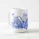 Esta taza tiene un diseño monocromático con un té azul y blanco rodeado de pájaros y flores.