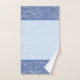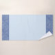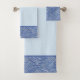 La elegante toalla de baño es de color azul medio. Se recorta con un patrón de borde que parece fluir agua. Este patrón proviene de una cerámica hecha a mano para el cuarto de baño. El patrón se llama "Flujo". Tiene un aspecto húmedo debido al brillante acristalamiento que se usó en la baldosa. Busca la baldosa en mi categoría de cerámica. Se puede embaldosar el cuarto de baño con ellas. Diseño de Oregon Tile maker, el Día de Fay Jones.
