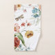 Juego de toallas con estampado floral con flores vívidas, mariposas y libélulas. La imagen superior muestra el conjunto colgado en una percha; la inferior lo muestra plano.