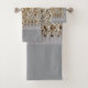 Un elegante diseño de encaje vintage cubre este juego de toallas de baño.