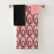 Este conjunto de toallas incluye un lavabo de salmón, una toalla de mano negra y una toalla de baño con un diseño moderno de mediados de siglo de un pequeño óvalo dentro de un óvalo más grande sobre un campo de salmón.